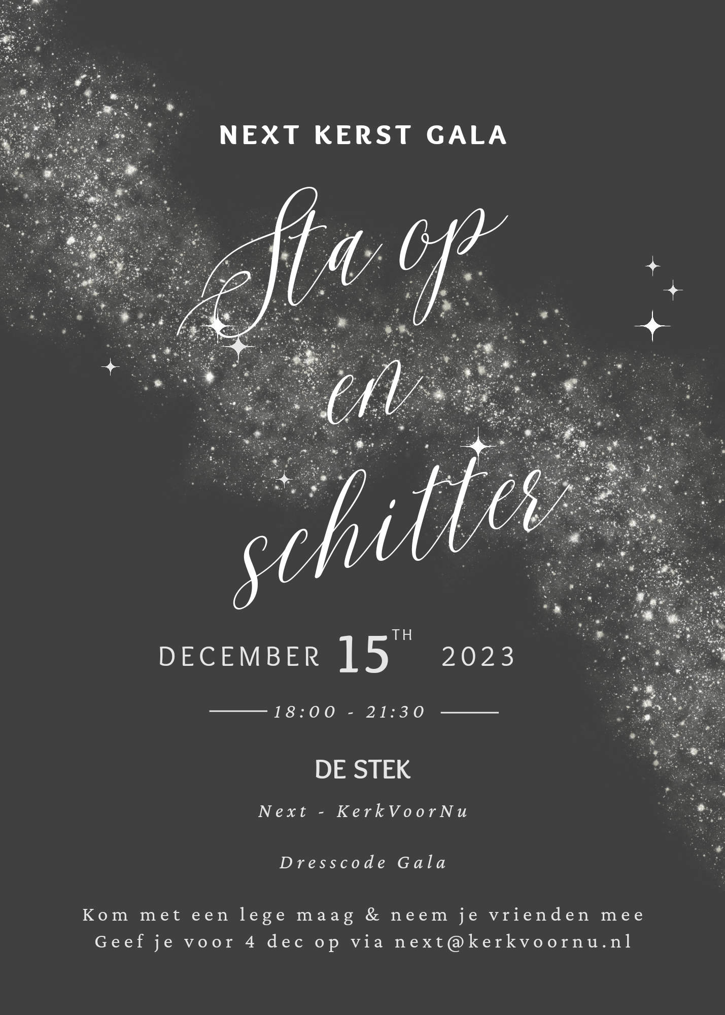 Ben jij tussen de 12 en 18 jaar oud en houd je wel van een feestje? Noteer dan vrijdag 15 december alvast in je agenda. Om 18.00 uur begint het NEXT Kerstgala met het thema "Sta op en schitter." Kom met een lege maag, want we beginnen met een heerlijke maaltijd. Daarna gaan we natuurlijk de dansvloer op.